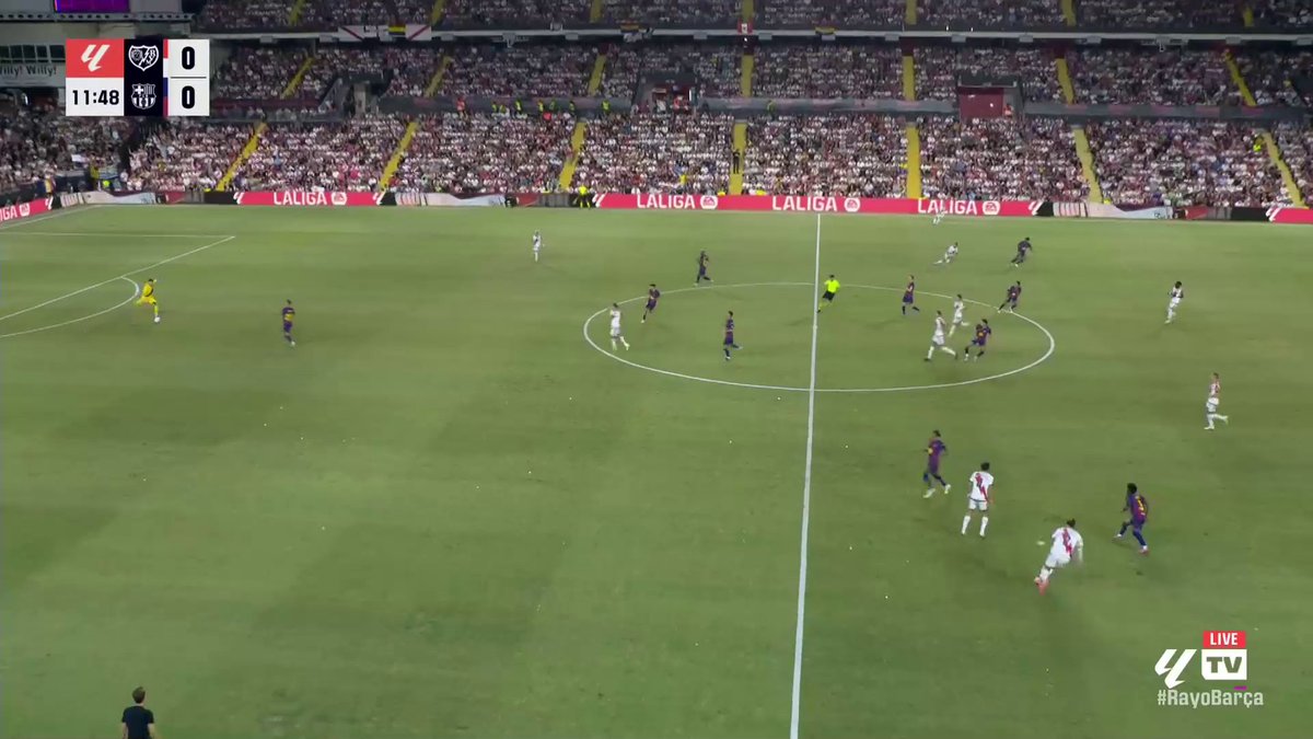 Flick mantuvo los roles del 1-4-3-3 de Mestalla, con Pedri cerca de la base y Raphinha más alto. Ferrán alternaba su posición, pasando a jugar por dentro cuando Koundé hacía salida de 3 (1-3-4-3).