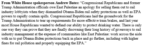 Trump "withdrew an Obama-era proposal to require faster brakes on trains carrying highly flammable materials, ended regular rail safety audits of railroads, and mothballed a pending rule requiring freight trains to have at least two crew members." politico.com/news/2023/02/2…