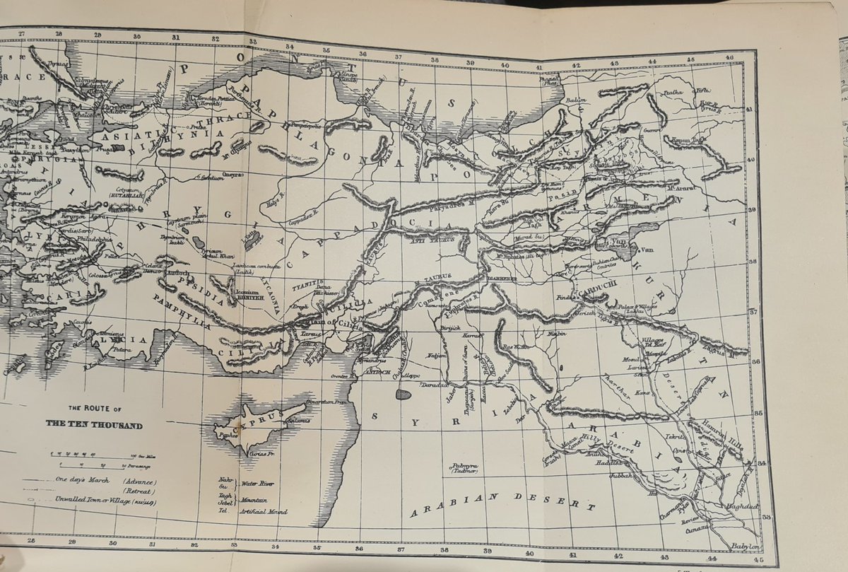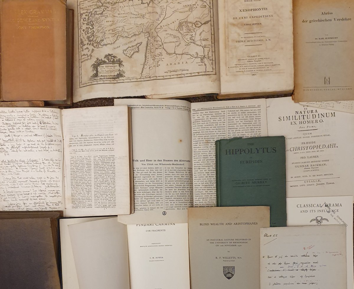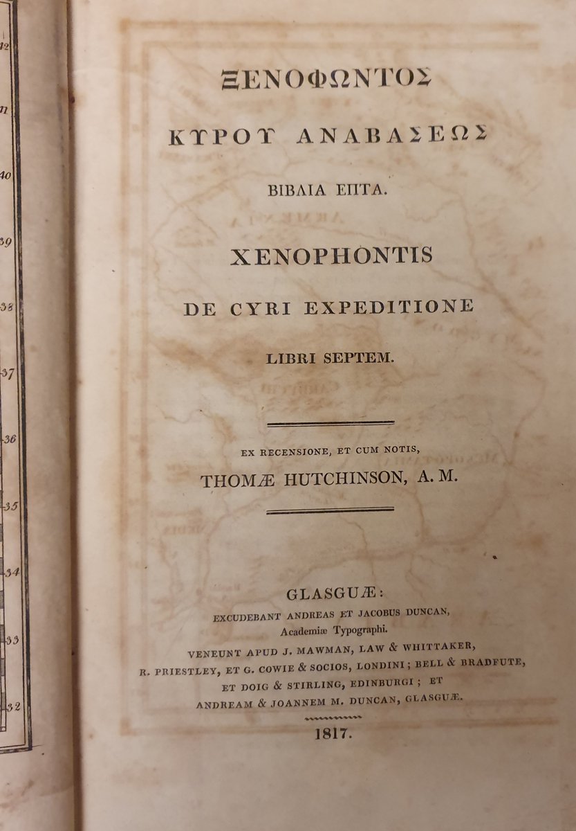 It's another mix! There's Thomas Hutchinson's edition of Xenophon's Anabasis (Glasgow, 1817), which has a fine fold-out map; there's a heavily annotated interleaved copy of Plato's Republic (ed. Stallbaum, 2 vols, Gotha, 1858) - the annotator is (later Canon) J. Sculthorpe-Jones.