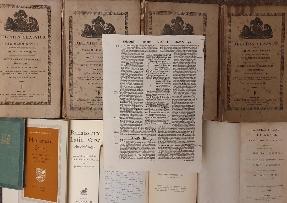 OK, a smorgasbord here. There's a leaf of the Froben Latin Bible, with commentary by Nicholas of Lyra (Basel, 1498). This bit's on the Book of Nahum. Then there's two pairs of Valpy's Delphin editions (1822), which contain Propertius and Martial, commented on from myriad angles.