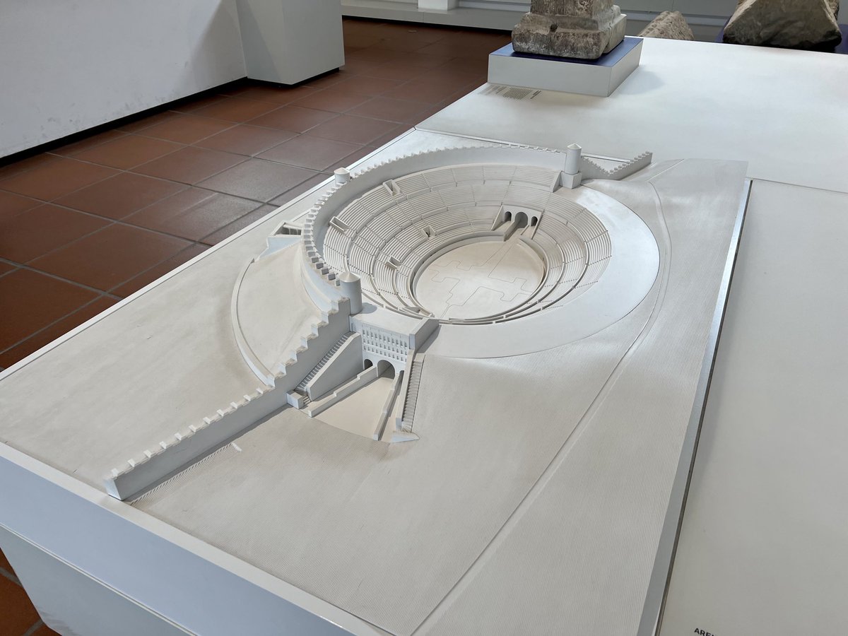 The immense amphitheatre had become a fortified town in the Middle Ages, with a couple of the defensive towers still standing on the perimeter lip of the arcades.