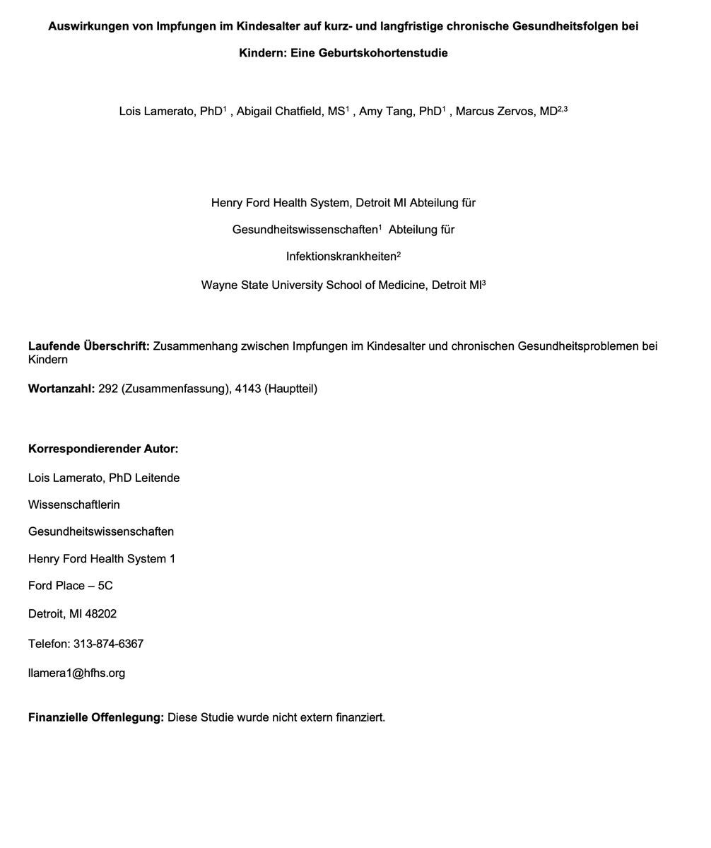 Detroit. – Eine groß angelegte Kohortenstudie des Henry Ford Health Systems (USA) hat brisante Ergebnisse veröffentlicht: Kinder, die im Laufe ihrer Kindheit eine oder mehrere Impfungen erhielten, entwickelten signifikant häufiger chronische Erkrankungen als ungeimpfte Kinder.