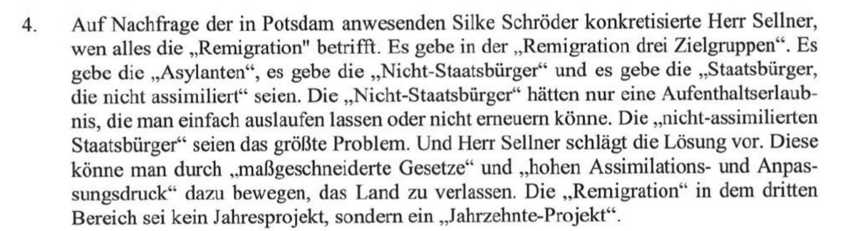 Potsdam-Teilnehmer: Das schon (greifen wir auch nicht ab). Aber: Die Abschiebung von Staatsbürgern haben wir NICHT "geplant" - wir haben darüber nur gesprochen und Deportationen aus Rechtsgründen verworfen.