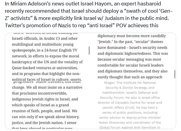 https://twitter.com/Tracking_Power/status/1933556570522112322One example, from a private account. A link to the article mentioned, by David M. Weinberg, former advisor to the Israeli Government and a member of the Misgav Institute (major Israeli think tank responsible for genocidal plans to depopulate Gaza):