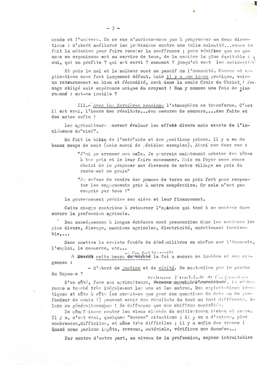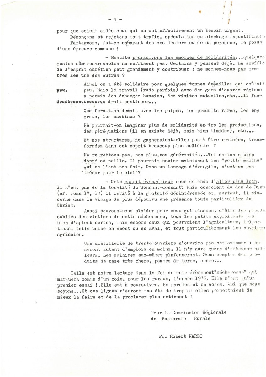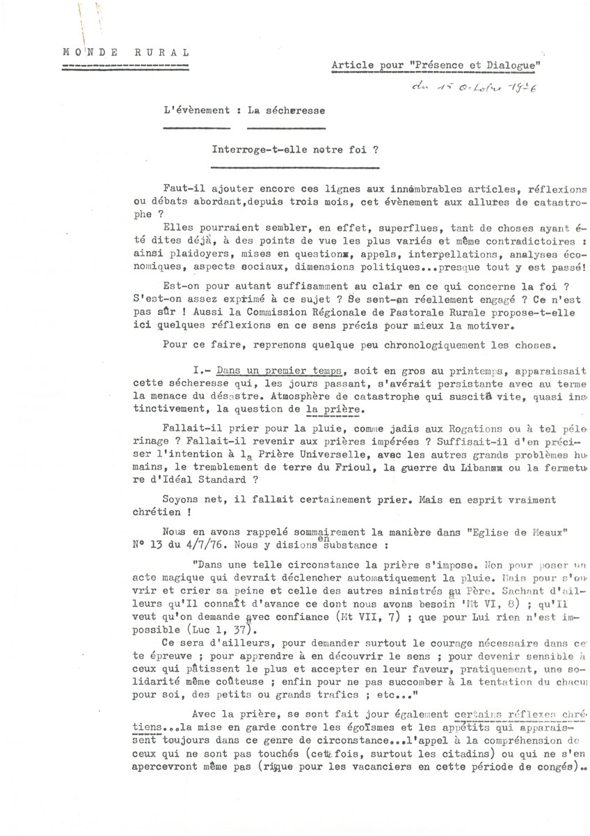 En juin 1976, frère Robert Naret, aumônier diocésain de Chrétiens en monde rural, écrit à ce sujet dans le bulletin diocésain de Meaux. Devant cet événement, dont il mesure l’intensité, il se sent impuissant. Toutefois, le frère l’affirme, il ne restera pas inactif.