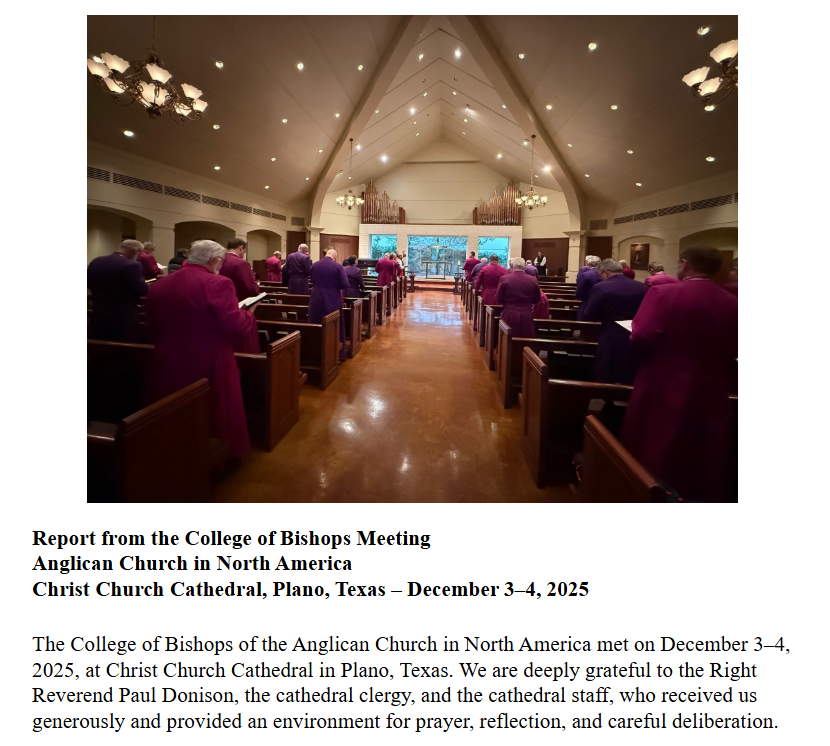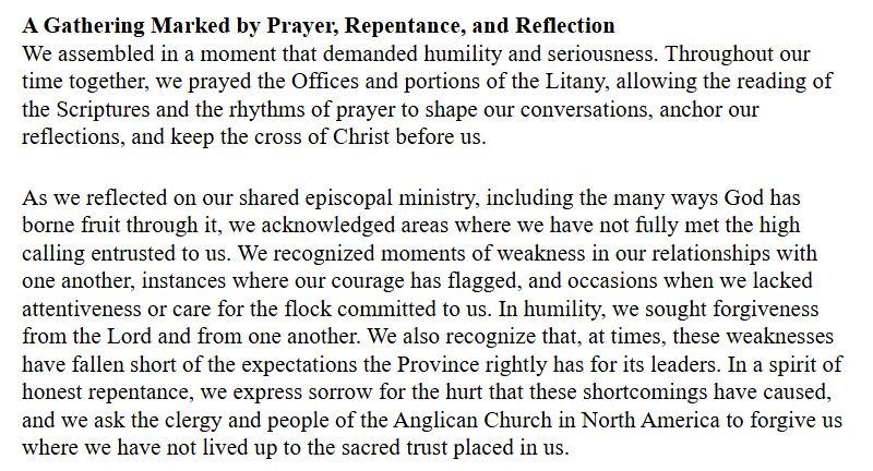 "In a spirit of honest repentance, we express sorrow for the hurt that these shortcomings have caused, and we ask the clergy and people of the Anglican Church in North America to forgive us where we have not lived up to the sacred trust placed in us."