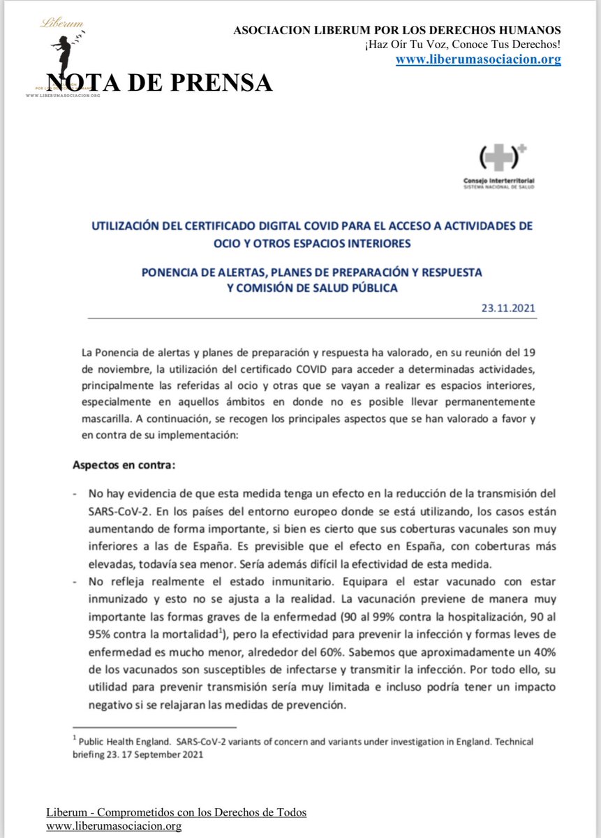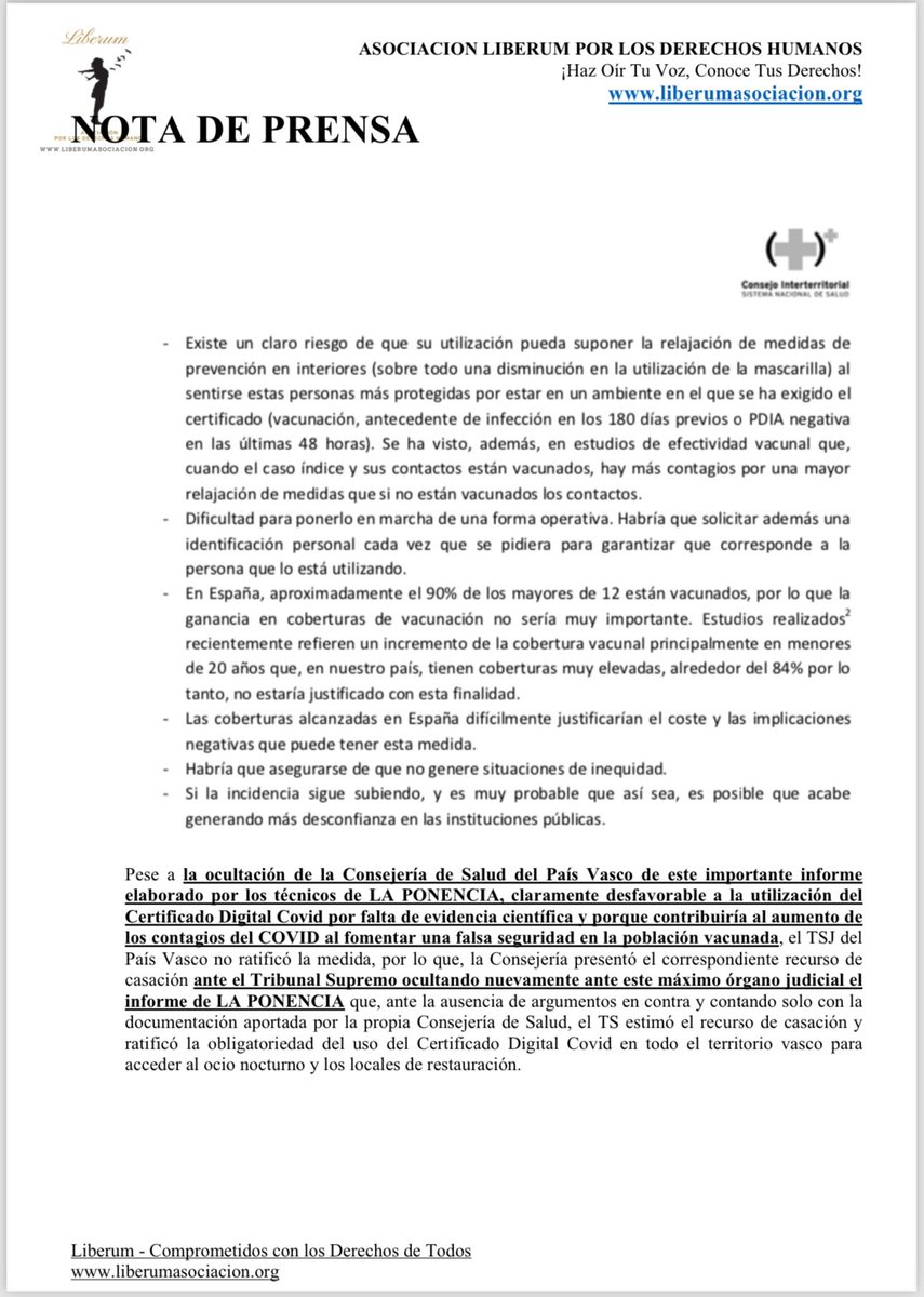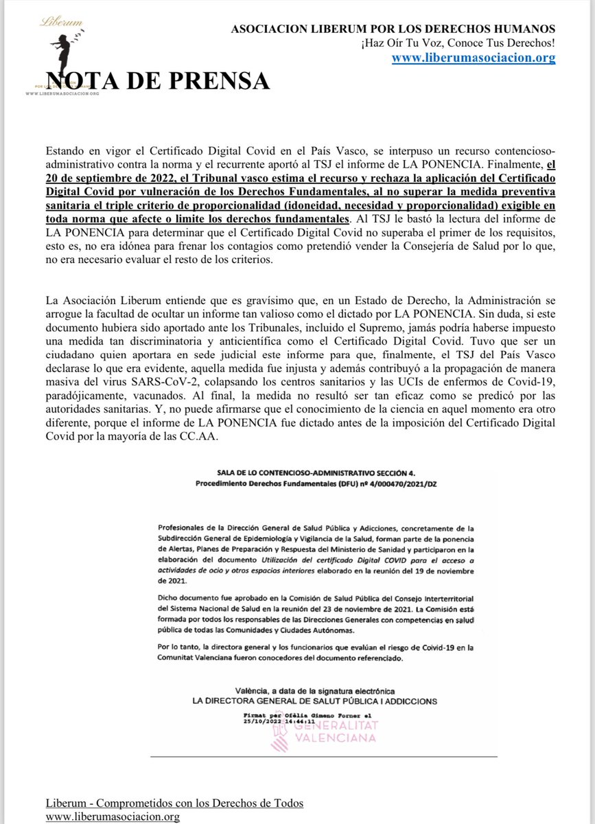 El Gobierno Vasco ocultó al tribunal que el 19 de noviembre de 2021, se reunió la PONENCIA DE ALERTAS, PLANES DE PREPARACIÓN Y RESPUESTA Y COMISIÓN DE SALUD PÚBLICA DEL CONSEJO INTERTERRITORIAL, SISTEMA NACIONAL DE SALUD, (LA PONENCIA) para evaluar la «UTILIZACIÓN DEL CERTIFICADO DIGITAL COVID PARA EL ACCESO A ACTIVIDADES DE OCIO Y OTROS ESPACIOS INTERIORES».