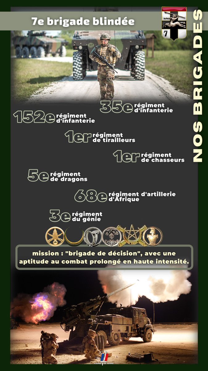 1/The 7th Armored Brigade (7e BB) is one of the two heavy brigades of the French Army, the other being the 2nd Armored Brigade. It is composed of 7 regiments and like all the other brigades is a combined arms formation.