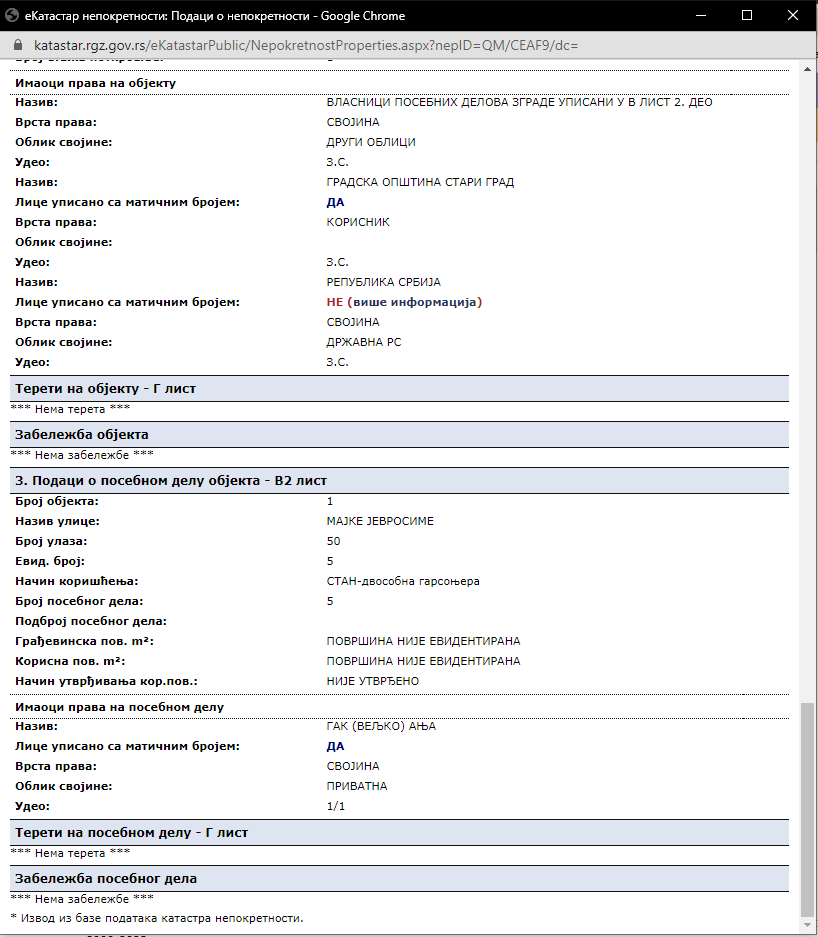 U katastru stanu je kvadratura nepoznata. Ono što znam da je kompletno renoviran i proširivan.