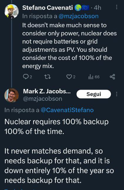 First: Nuclear does NOT require backup, neither 100% nor 100% of the time. It’s a fact: countries with nuclear plants do not need to build extra gas plants or storage facilities, they just don’t do that. This is a basic reality check, and Jacobson fails is brilliantly. 2/n