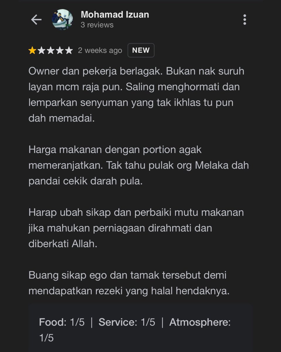 2. Difahamkan, ramai pelanggan memberikan satu bintang kerana tidak berpuas hati dengan layanan kurang mesra para pekerja selain kualiti makanan serta harga yang mereka sifatkan ‘mengalahkan Israel’.