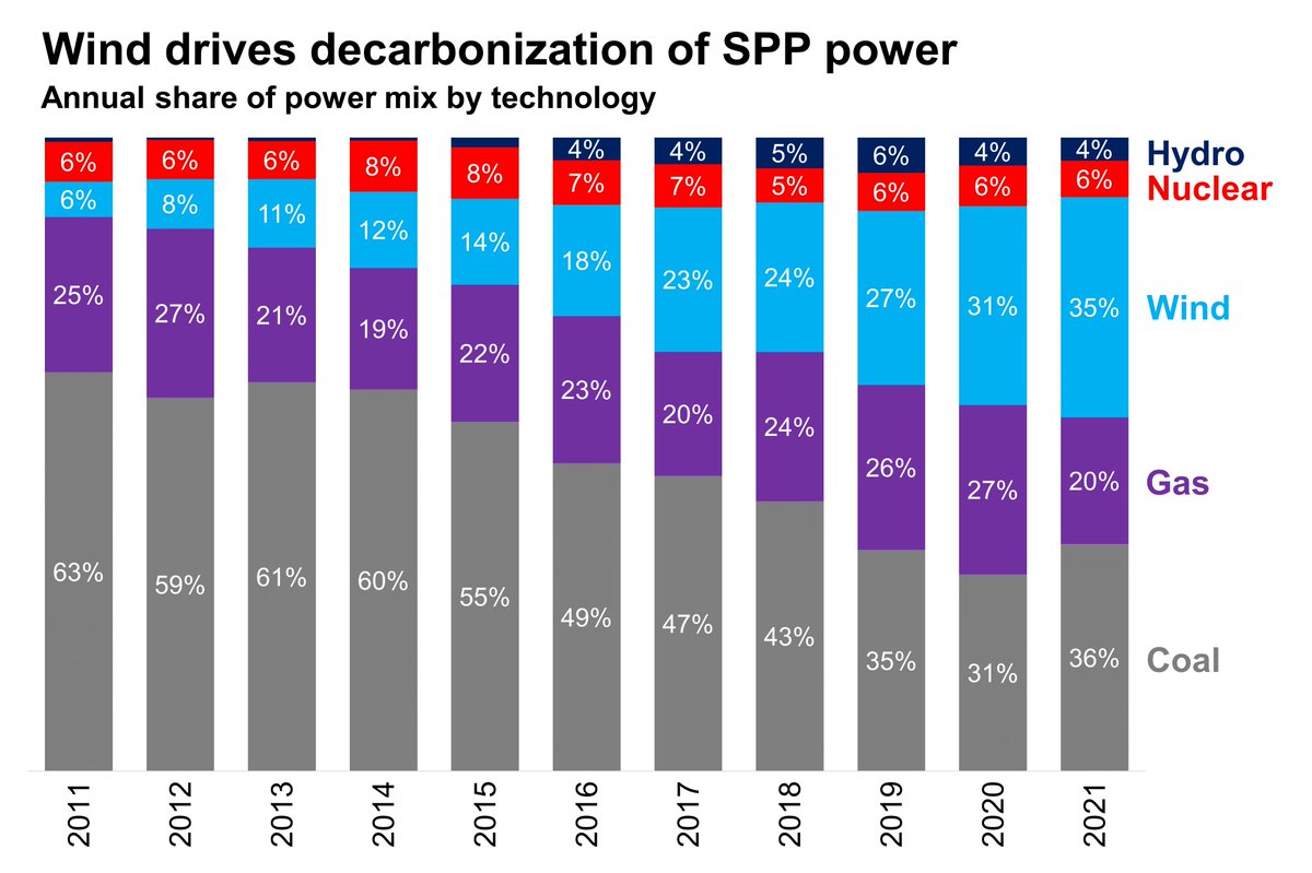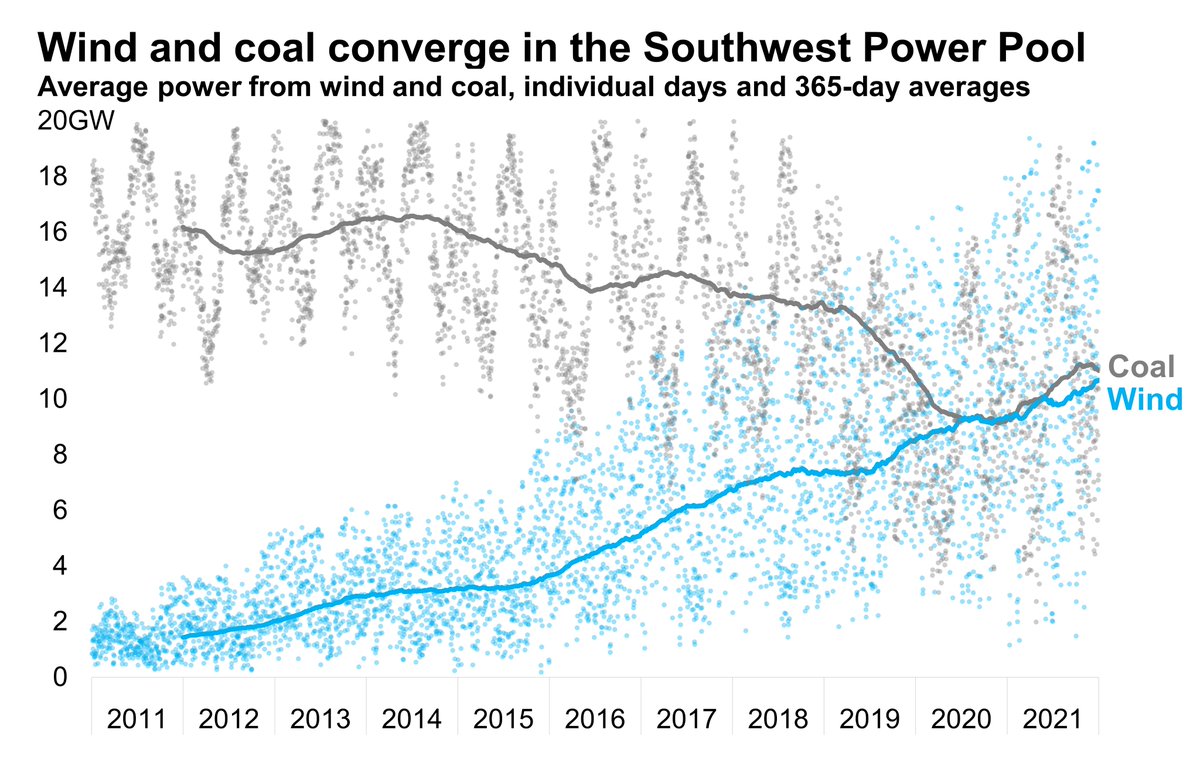 Wind vs. coal in SPP. Wind was the largest source of SPP electricity in 2020. Higher gas prices in 2021 put coal back on top.