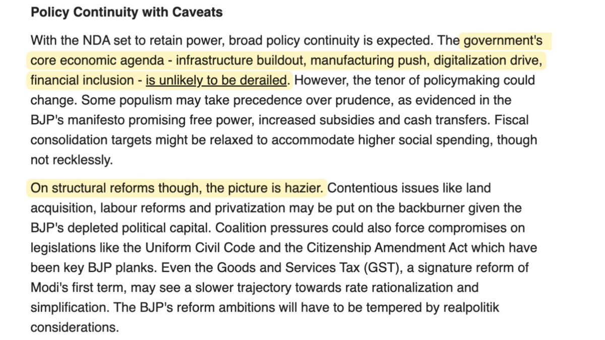 Policy continuity is expected but with caveats. Some populist policies may take precedence, in an effort to win in a coalition setup.