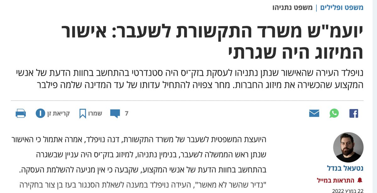 לדידי הגב׳ נויפלד לא הייתה ראויה לאייש את תפקיד יועמשית משרד התקשורת כמו גם התפקיד הנוכחי יועמשית משרד הבריאות, בשל ניגוד עניינים הא ותו לא.