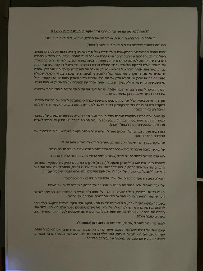 גורם בכיר ברשות השניה מסר לידי פרוטוקול סיכום ישיבה שהתקיימה ביום 8.12.22 בין יו״ר הרשות השניה, מנכ״ל הרשות, היועמ״ש ונציגת הציבור מחדשות ערוץ 13 ד״ר יפעת בן חי שגב.