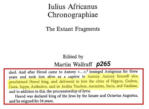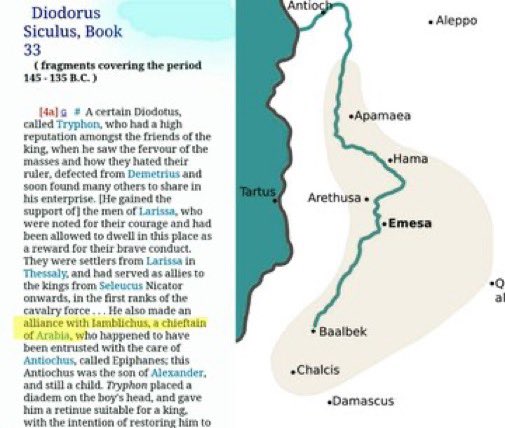 Homs & Surroundings: Cicero, Cassius Dio, and Diodorus Siculus show Iamblichus, prince of Homs, was Arab, making Homs Arab land. Arabs inhabited Homs, Apamea, and nearby areas. Sextus Africanus shows Golan, Hauran, and Lajat were also part of Arab lands under Herod.