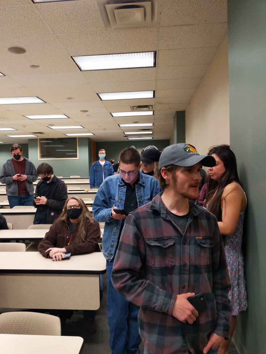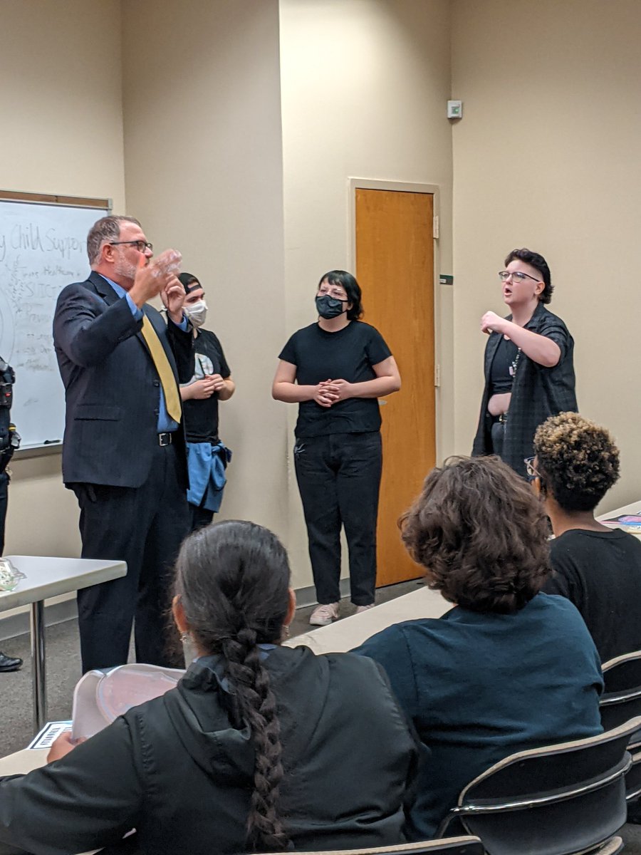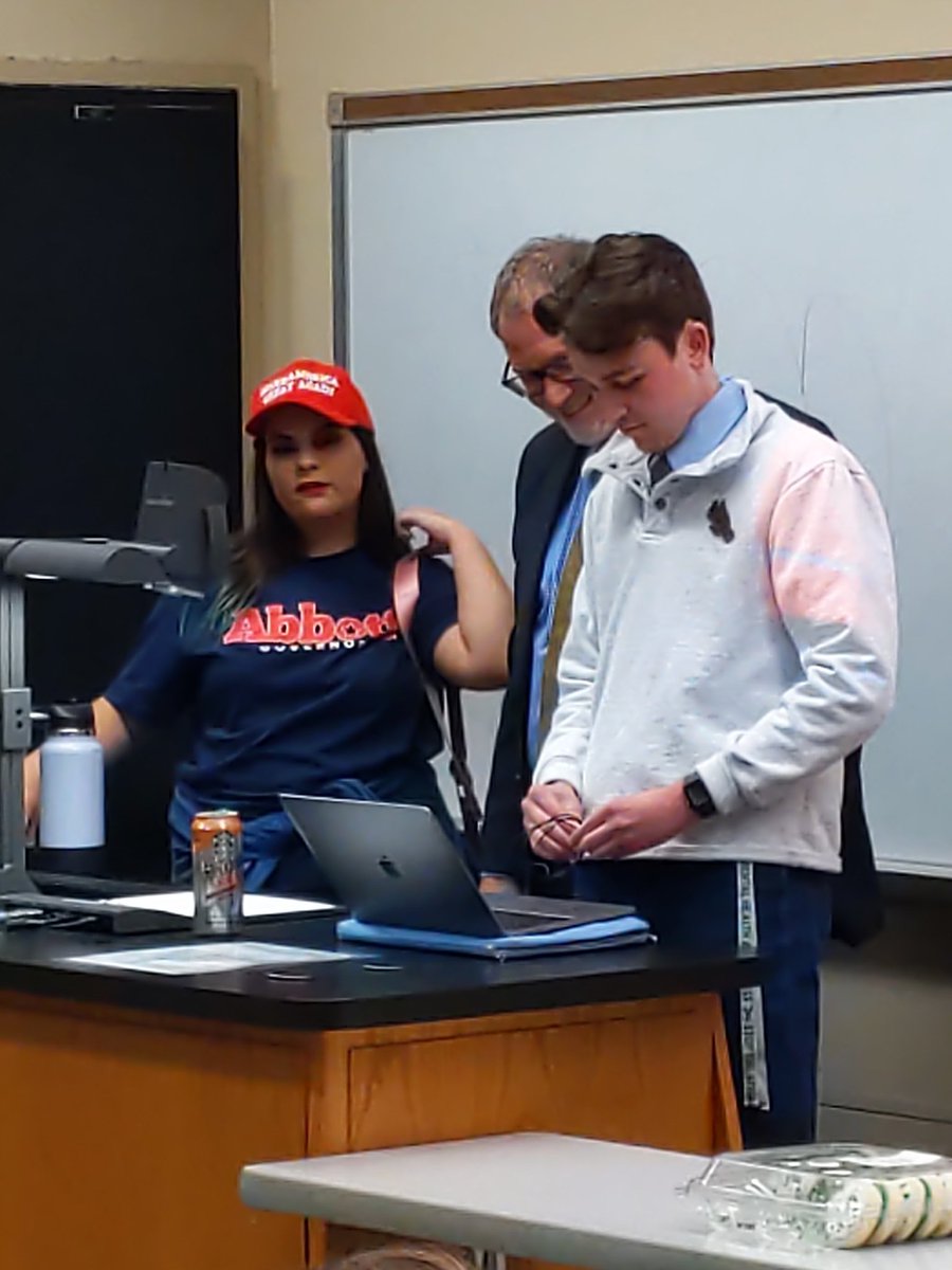Kelly, speaker, and another student entered, mostly boos, and a couple of cheers