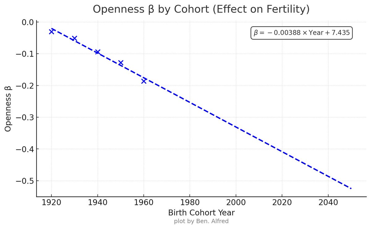 the paper found a linear decrease in menās fertility ORs per sd increase in openness across cohorts over time, with no indication of the trend slowing or reversing.