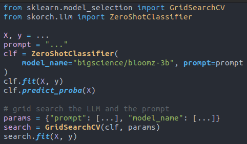 Because we build on Hugging Face transformers, you have the choice among thousands of models. It also means that your Large Language Model runs locally and skorch can perform some optimizations under the hood to speed things up.