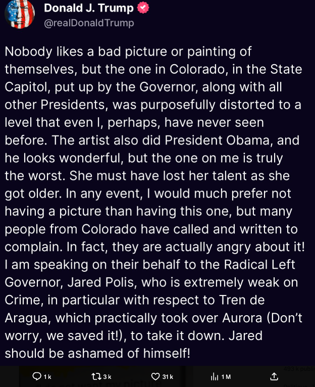 Il se plaint qu'au capitole du Colorado, le tableau qui le représente soit très peu flatteur (alors que celui d'Obama est vachement bien. C'est pas faux. D'un autre côté, essayez voir de peindre Obama moche ou Trump beau, qu'on rigole).