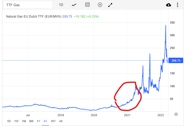 Looking at it in a 5-year perspective, you can clearly see that Phase 1 started last year. From April to October the price of gas quadrupled. Part of this was recovery from the pandemic, but the main thing here is that Gazprom started limiting exports and, crucially storage.
