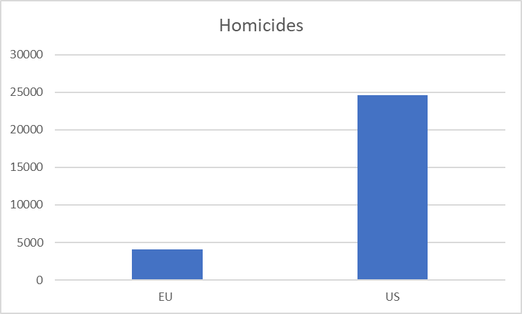 A lot of people think the US is a more violent society. And it is true there are more intentional homicides in the US than the EU (data for 2021)