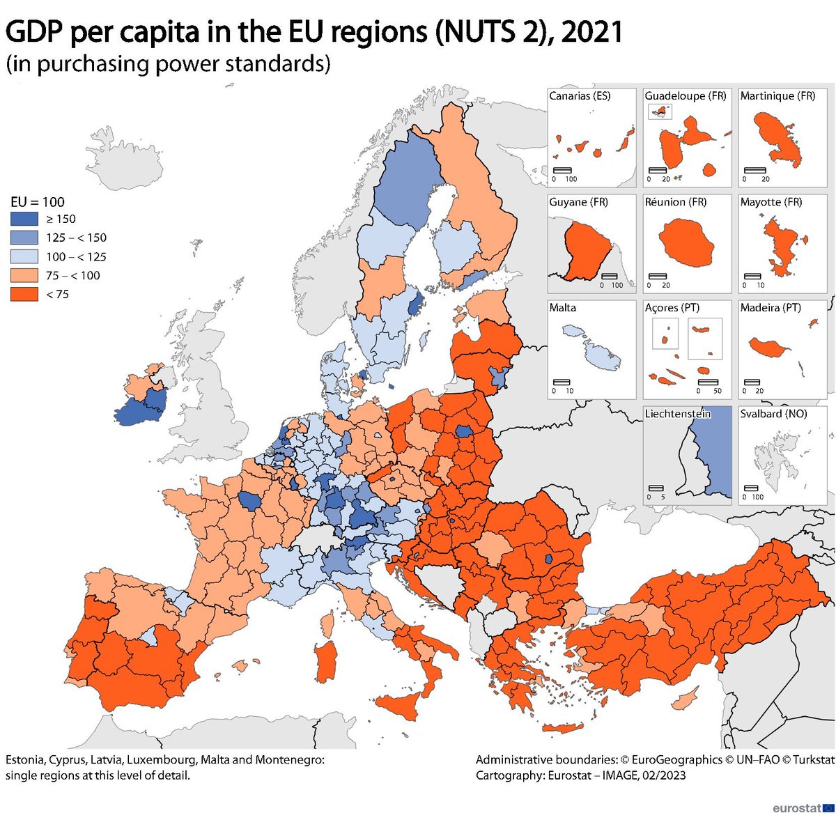The engine of the European economy is the zone that stretches from Northern Italy through Austria, Switzerland, much of Germany, Benelux, and southern Scandinavia. Paris is a wealthy enclave by itself. Also some might be surprised by Warsaw and Bucharest here.