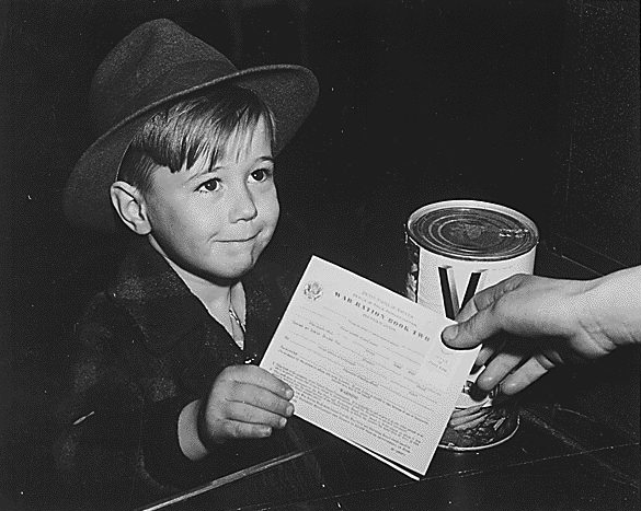 2. An eager school boy gets his first experience in using War Ration Book Two. With many parents engaged in war work, children are being taught the facts of point rationing for helping out in family marketing." (February 1943)