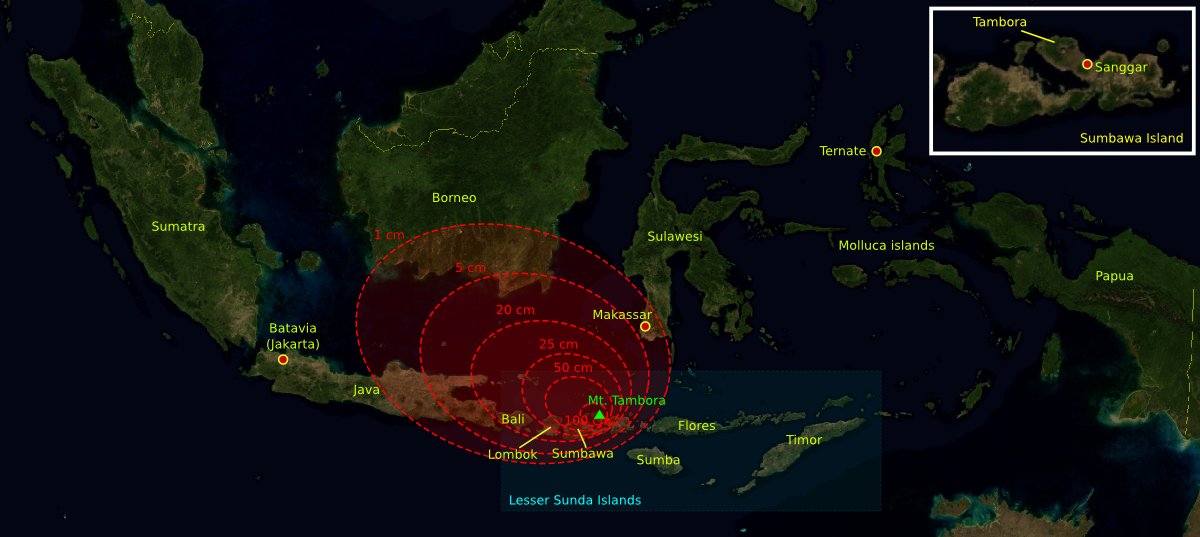 April 10, 1815: Mount Tambora in Indonesia erupted with a force 100 times greater than Mount St. Helens.
