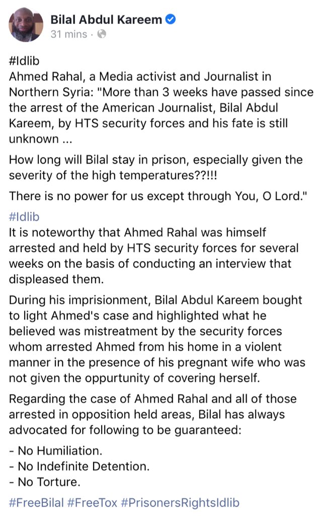 Ahmed Rahal, a Media activist & Journalist in Northern Syria: "More than 3 weeks have passed since the arrest of the American Journalist, Bilal Abdul Kareem, by HTS security forces & his fate is still unknown ...”