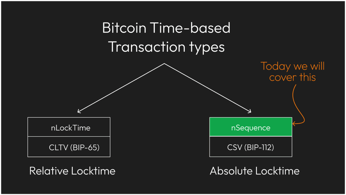 - Absolute LockTime: Spendable **at** a specific time/block (e.g. after block 800,000).