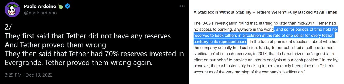 Bitfinex/Tether essentially used tethers so-called reserves to cover up an $850 million dollar loss for bank fraud and money laundering, and then Bitfinex/Tether needed a crypto-bailout. The same bailout that SBF/FTX was hoping for.