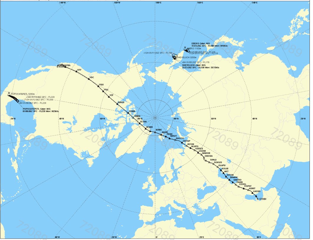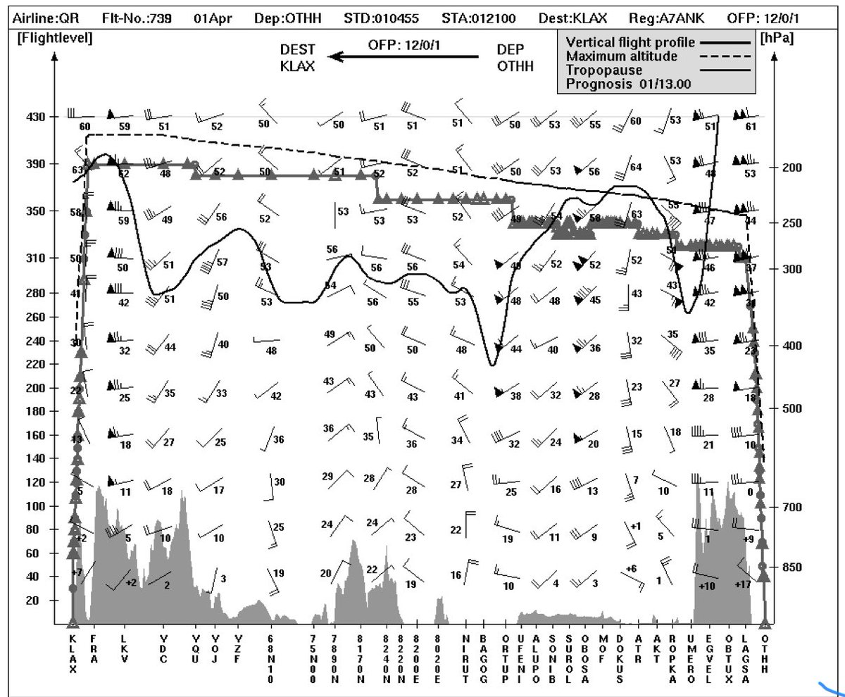 La línea sinuosa es la tropopausa. Divide la troposfera de la estratosfera, y varía cada día con la temperatura y mucho con la latitud. Este es un viaje Doha LAX en ruta polar…