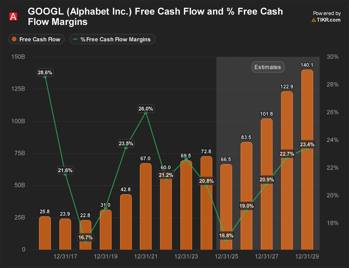 Despite massive AI investment, Alphabet is projected to sustain free cash flow margins above 20% over the next several years, one of the few companies able to combine high growth with durable profitability.