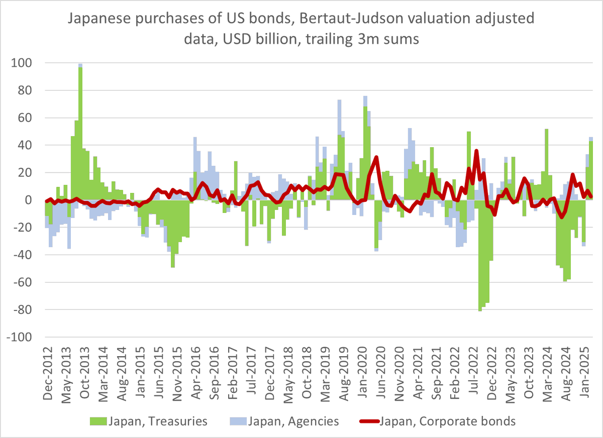 The balance of payments data doesn't provide any detail on hedging -- but the total flow into US bonds has been pretty stable at a $600-700b annual pace. And (net) inflows into US equities have been unusually strong (and equity flows typically are not hedged)