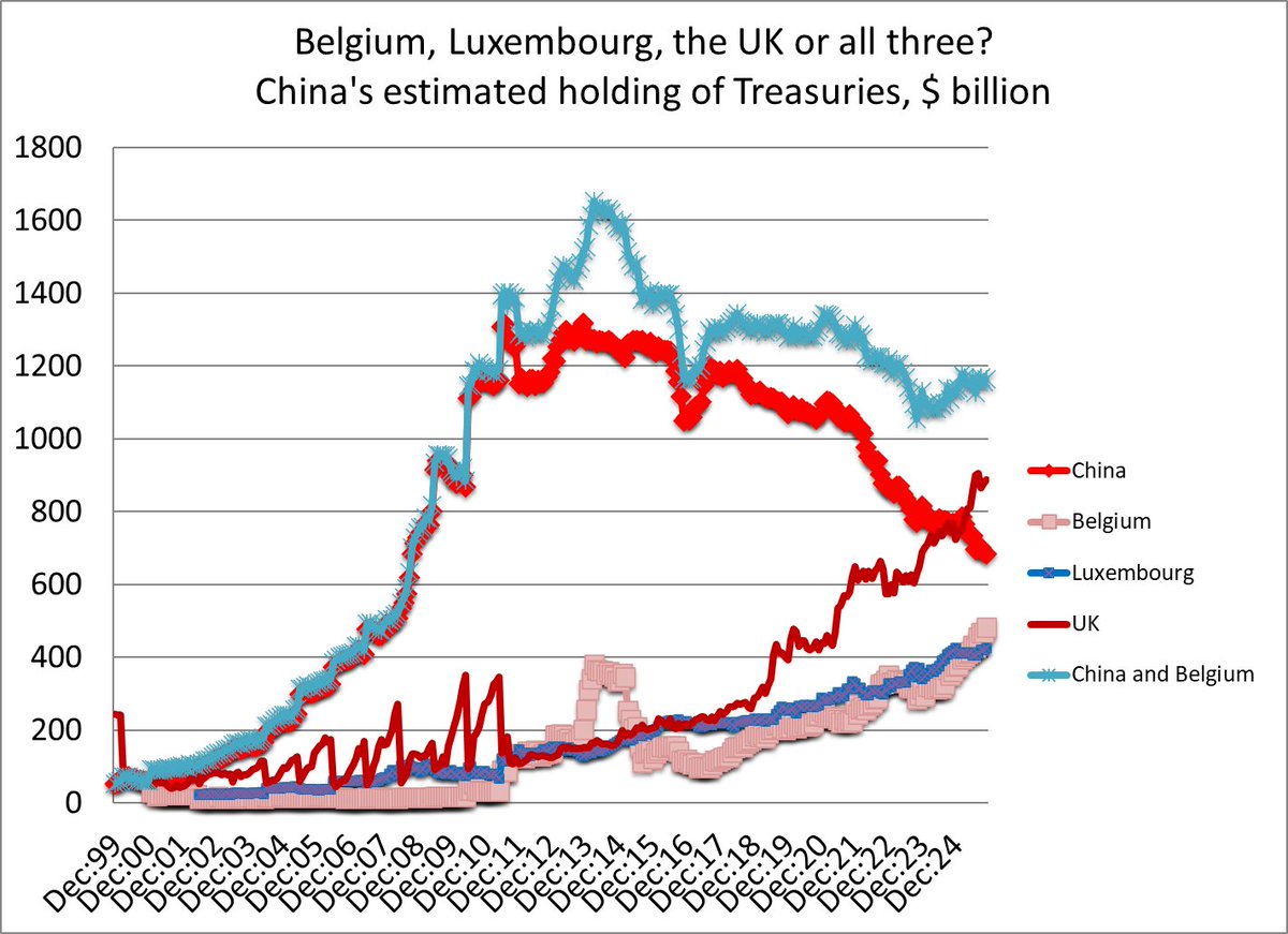 Even adjusting for Euroclear (part owned by the PBOC incidentally) and short-term holdings, there is no visible net flow from China into the US bond market over the last 8 years ...