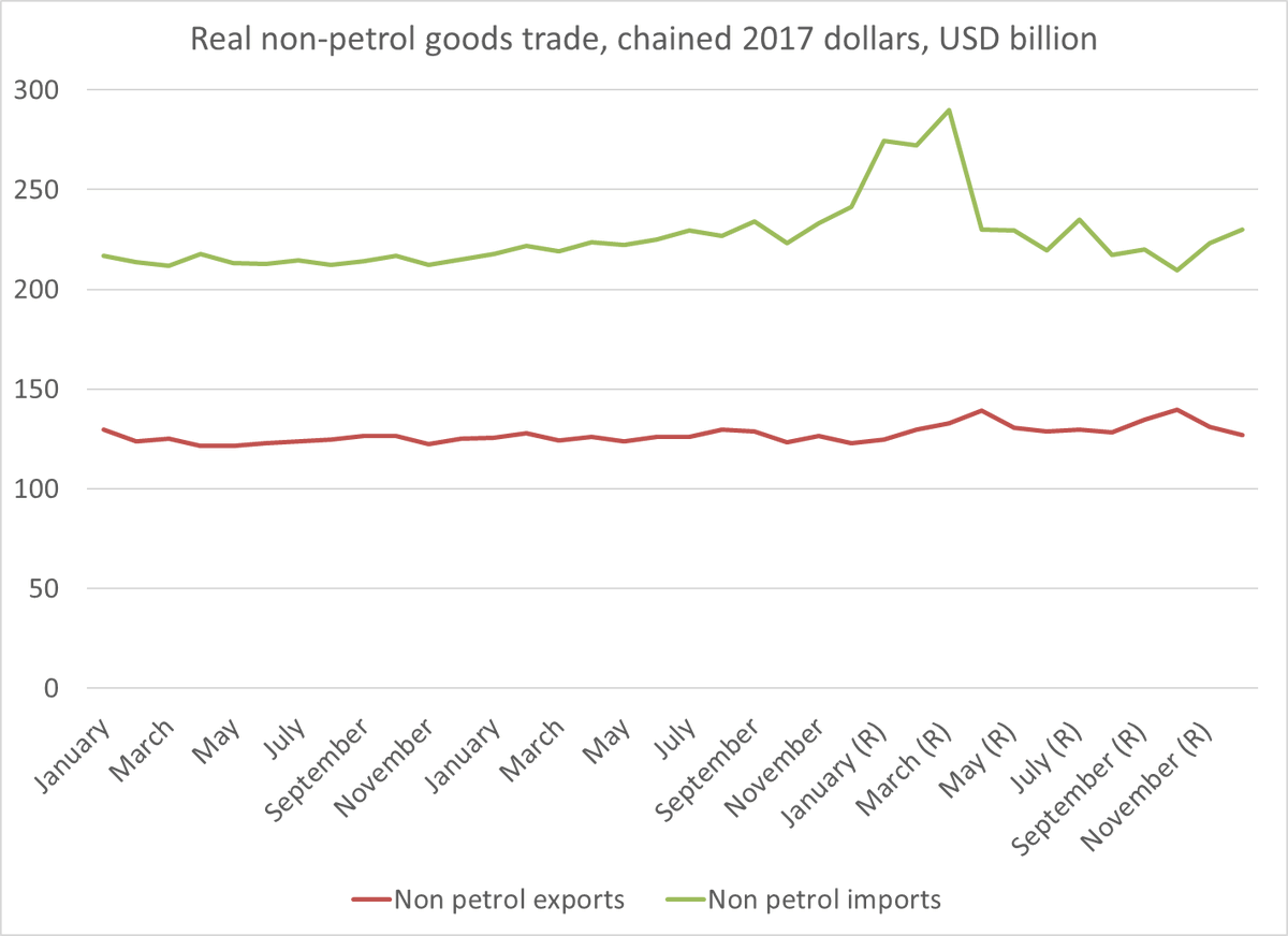 the tariff front running is obvious in the import data for q1 2025 (heavily pharma and gold, which weren't tariffed in the end). there was some payback later in the year ... I think the December uptick in imports tho is a real signal