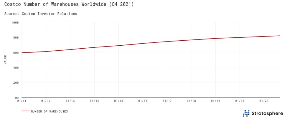 Today, Costco is just over 800 warehouses (stores) with over 80% of locations in North America.