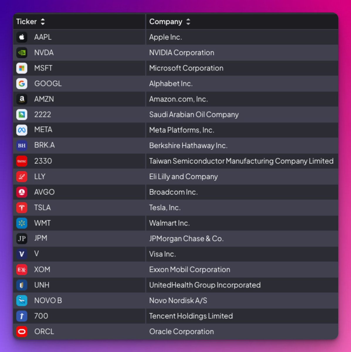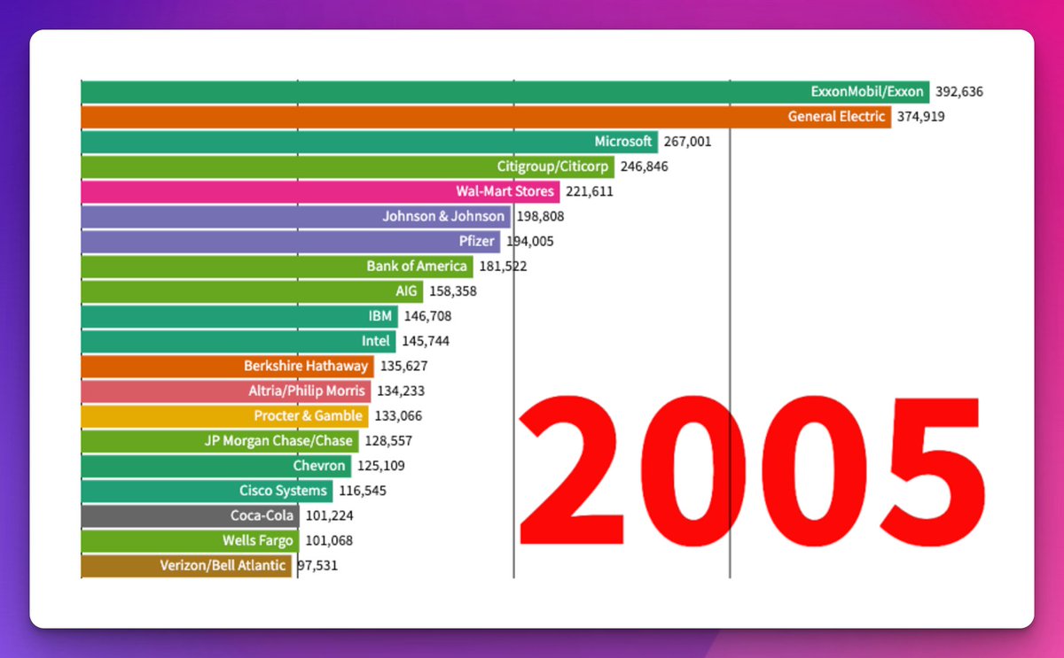 Here are the top 20 today. Small interesting note is the companies remain in both lists are Microsoft, Exxon, Walmart, Berkshire and JP Morgan.