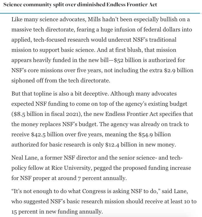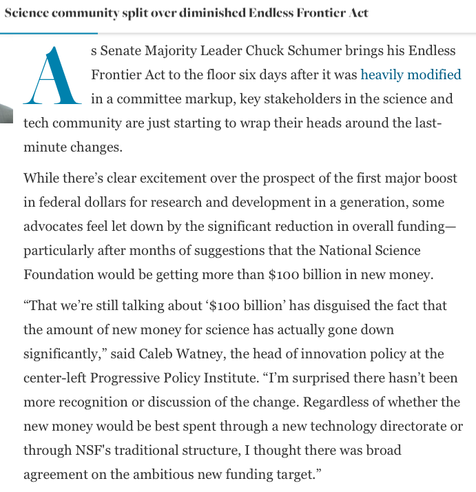 @calebwatney Schumer's still touting Endless Frontier as a $120 billion bill, and that's true - but it's not all new money.