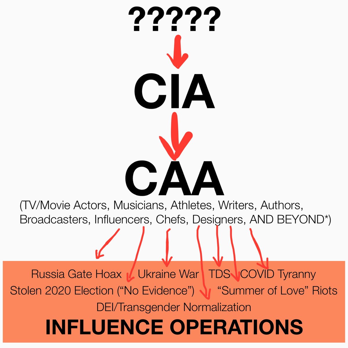 I made this image a while back to keep track of the power structure of how the massive social disruptions over the past several years have been FAR from organic and how it all ties back to the CIA/CAA