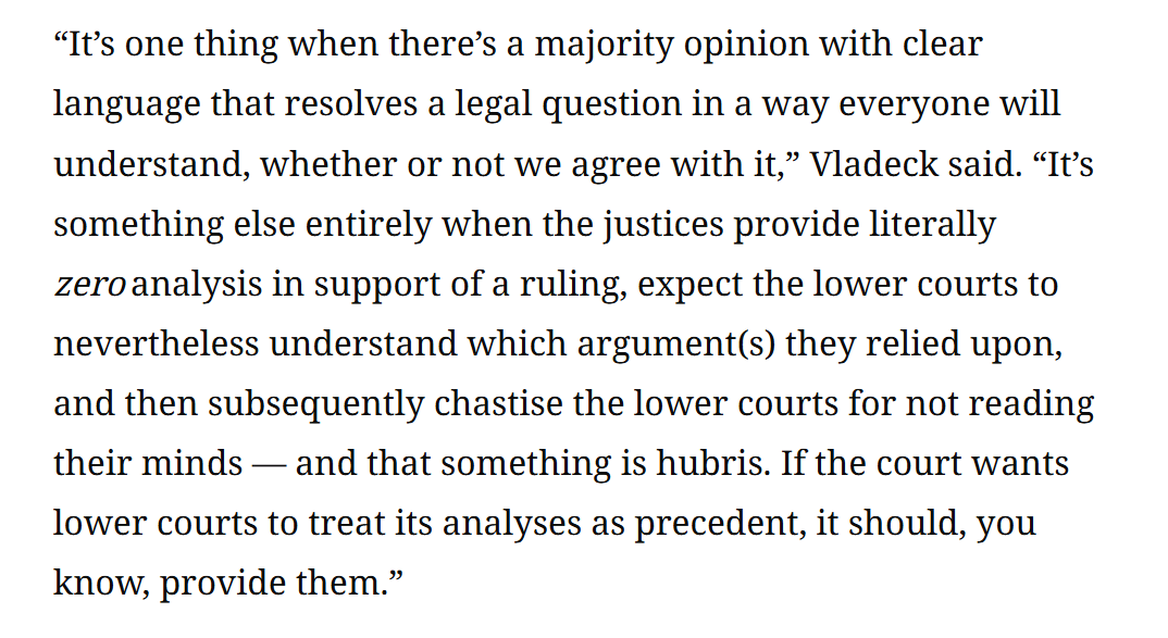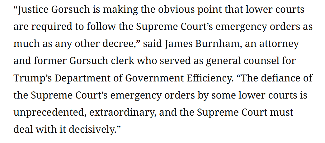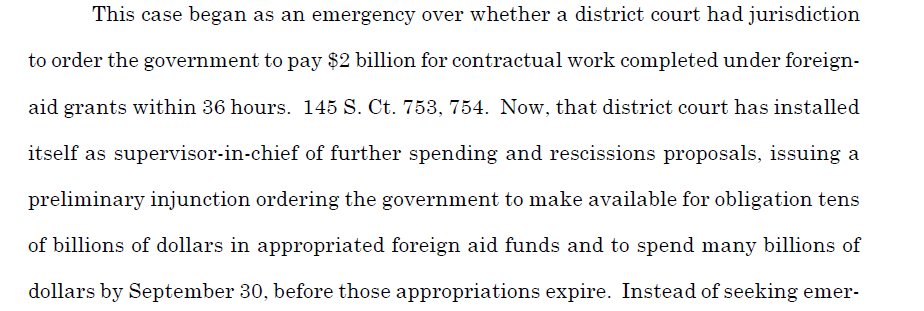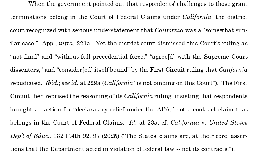 https://twitter.com/joshgerstein/status/1958631914837090738First, the ruling is correct and consistent with previous orders the Court has issued on the emergency docket. As we've discussed before, people who claim the government owes them money have to go to a special court to sue for money. They can't get TROs or injunctions. 2/