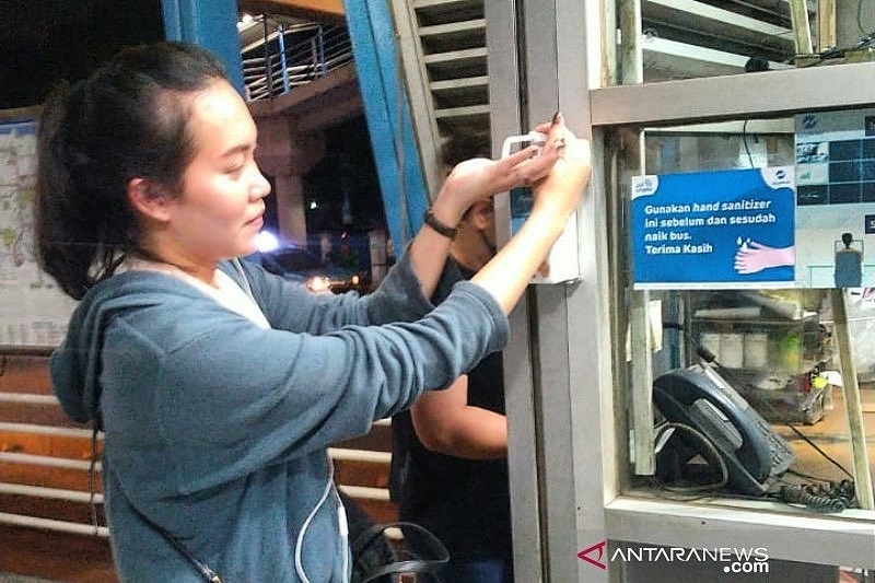 @PT_Transjakarta menyiapkan cairan pembersih tangan (hand sanitizers) di 80 halte utk mencegah penyebaran virus corona (Covid-19) & menjaga kebersihan tangan para penumpang Bus Rapid Transit (BRT) itu