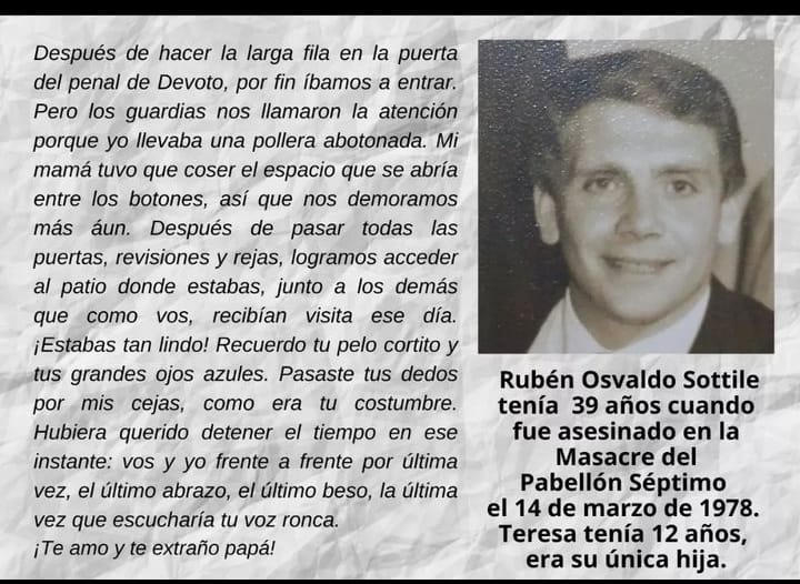 Teresa y Vero completaron la información sobre lo que había pasado con sus padres leyendo "Masacre...". Vero lo vio en una vidriera de una librería de Lanús, entró, buscó mi teléfono, me llamó. Nos encontramos en un bar cerca de la estación, allí en el conurbano sur.