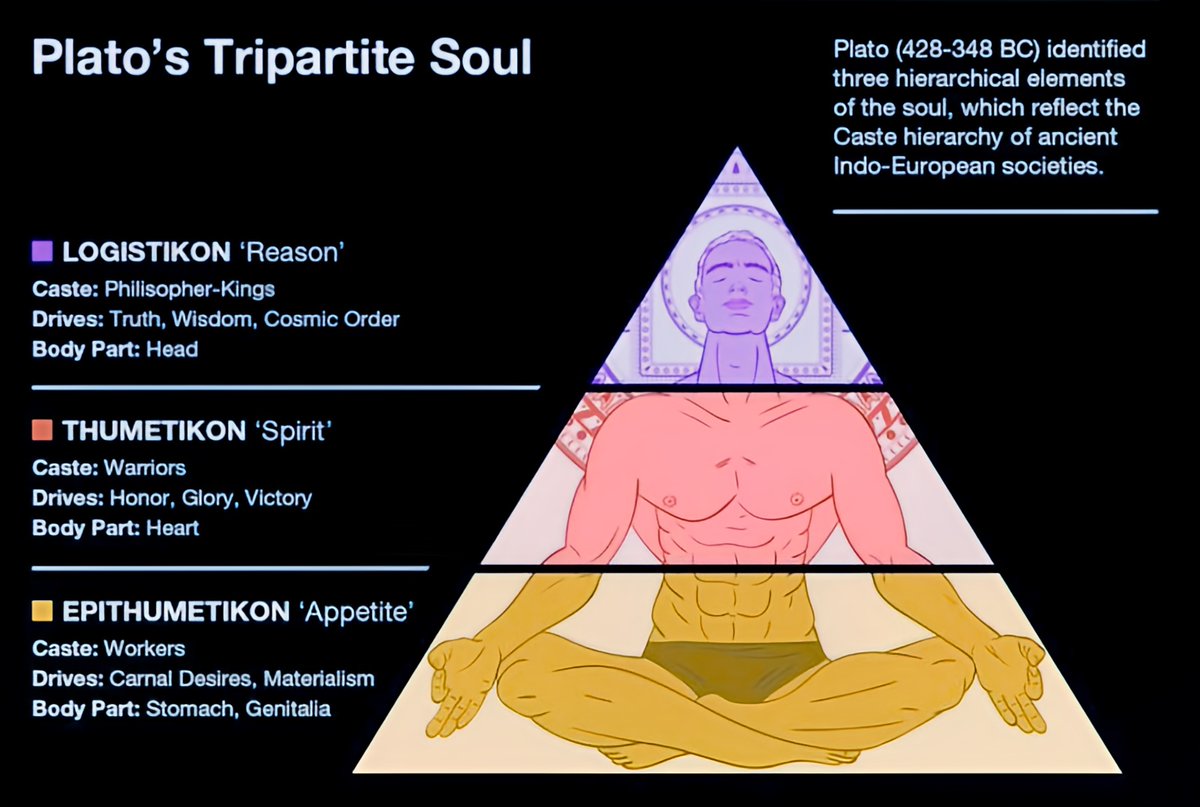 Thus the Indo-European bequest is no antiquarian relic but the very code of Europe’s being, a grammar of order that reappears whenever the continent rises to self-consciousness. To recover it is not to imitate dead forms but to awaken again to the structure that underlies both cosmos and man. The tripartite law is the architecture of reality itself, and Europe’s destiny has always been to discern, to articulate, and to live according to that measure.2/ If Indo-European society was ordered according to a tripartite law, it was because this law was already inscribed within the soul itself. Political forms are not arbitrary inventions, nor the product of mere expedience; they are projections outward of the inner constitution of man. The city is the soul writ large, the macrocosm, and the soul is the city in miniature, the microcosm.