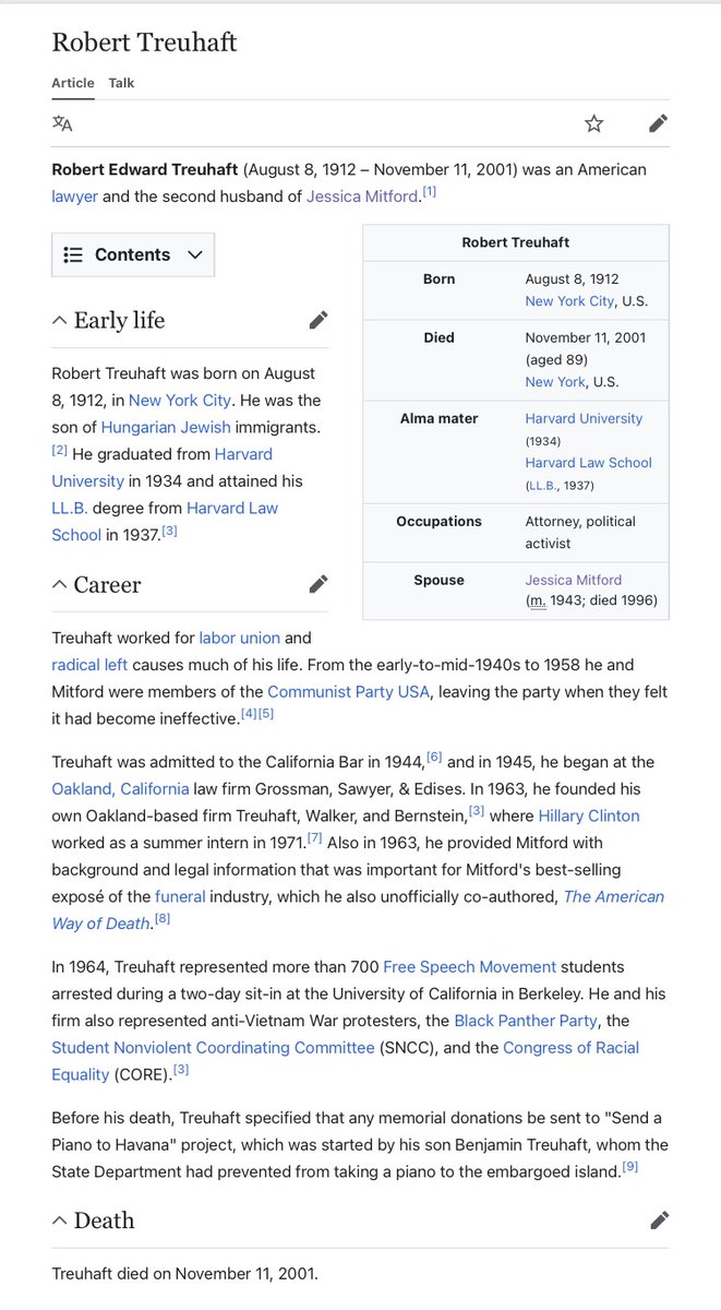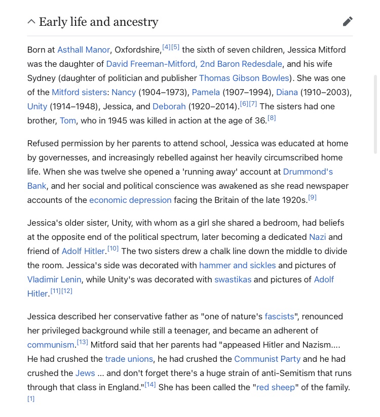 She was born to the nobility, stole daddy’s money to run away with Churchill’s nephew to fight for the commies in the Spanish Civil War, then married the head of perhaps the most important communist labor law firm in the US, & worked on countless retarded commie projects for him.