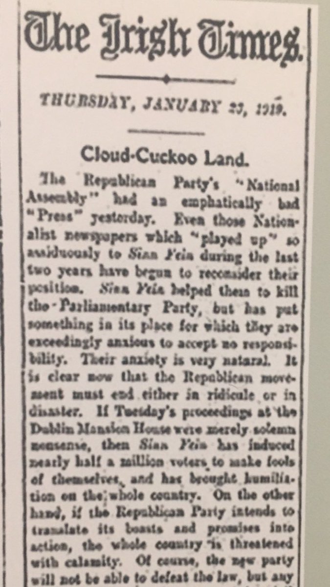 Report on the First Dáil, headlined ‘Cloud-Cuckoo Land’ which appeared in the Irish Times, then a pro-unionist newspaper. One of many fascinating exhibits in anniversary exhibition at Leinster House. Booking closed, but there’s talk of re-staging it later in the year. #Dáil100 2