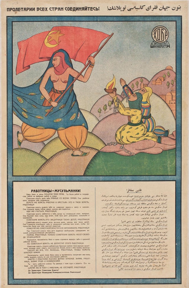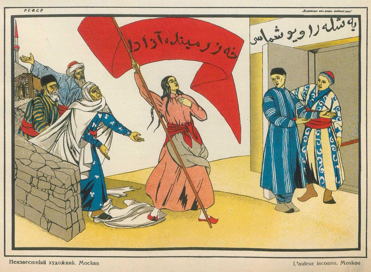 Otro más que no cabía, que me resulta particularmente bonito. Una mujer tártara rompiendo las cadenas de la familia y la religión para enarbolar la bandera roja.