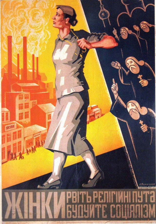 Algunos ejemplos de cartelería soviética denunciando el yugo de la familia y la religión para la proletaria.