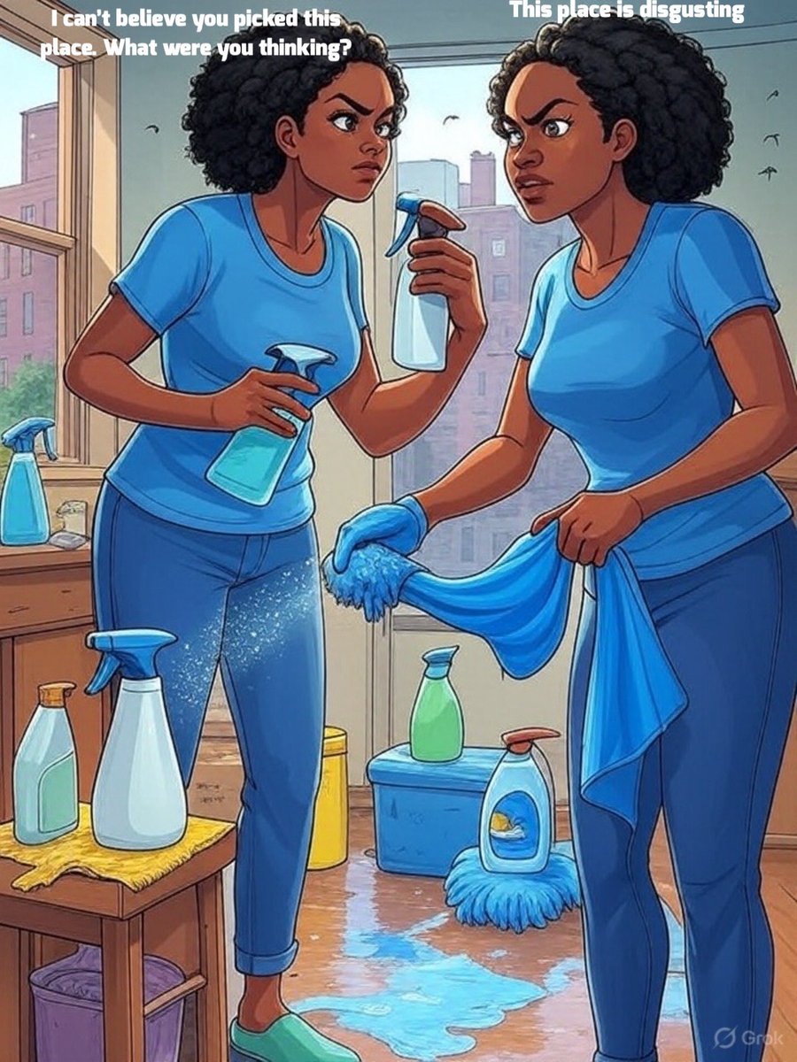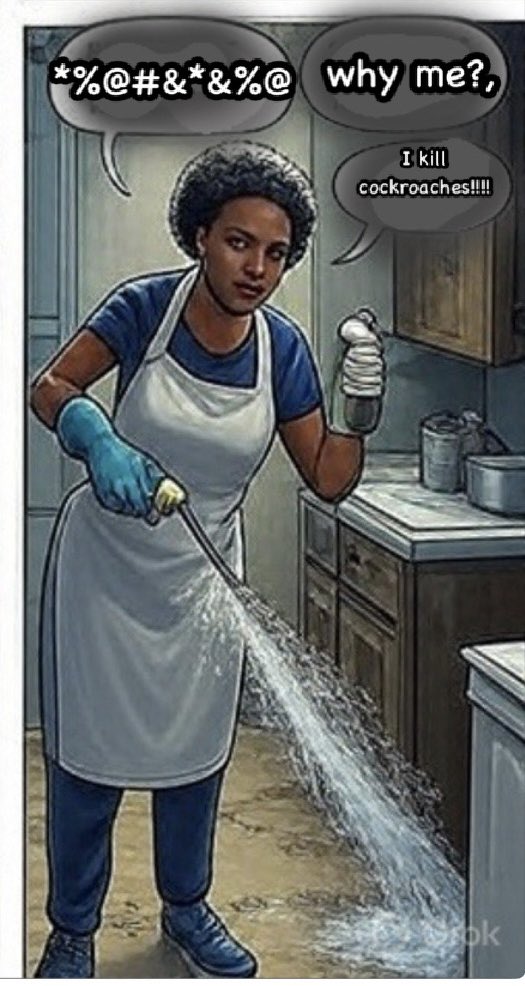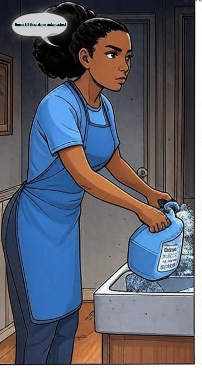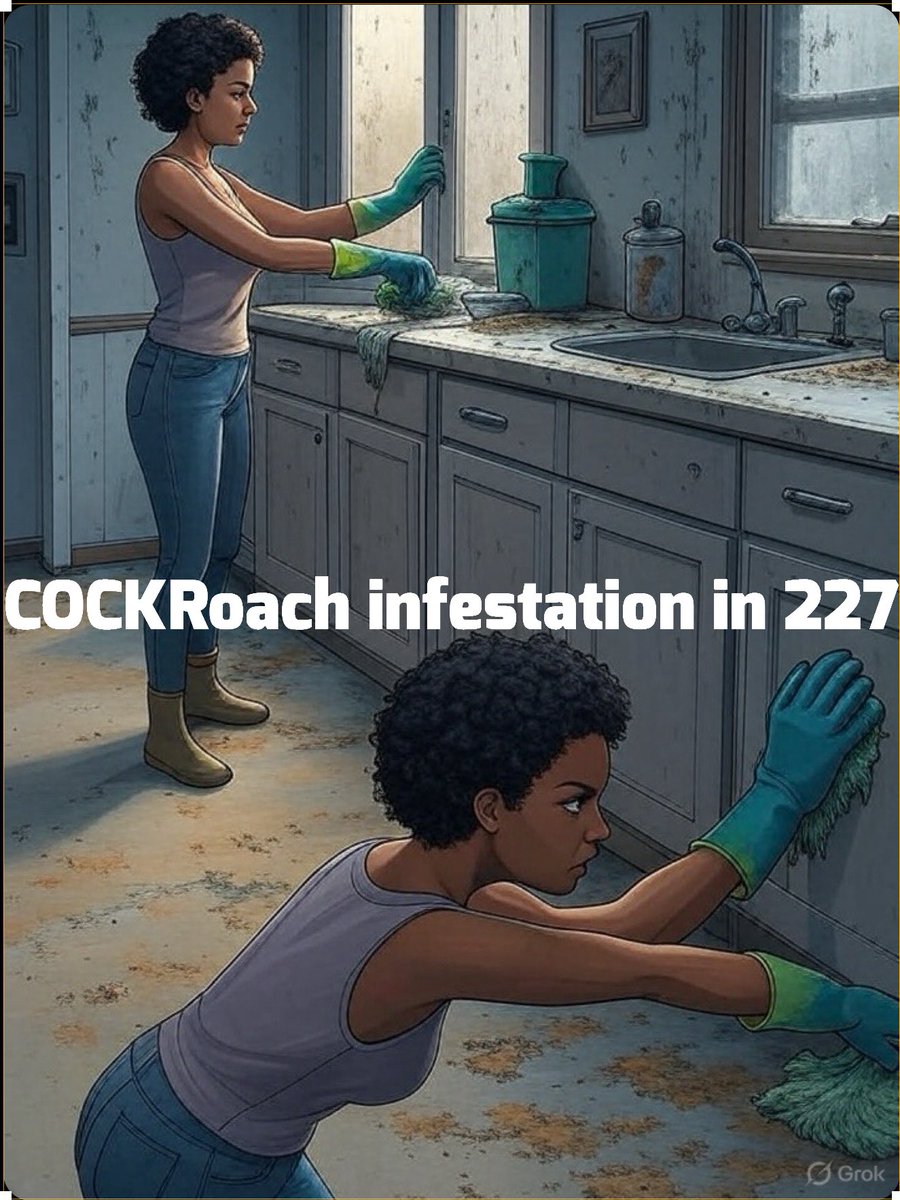 They begin cleaning cockroach poop from the walls and baseboards, counters, cabinets, sinks, windows, window seals, doorsā¦.